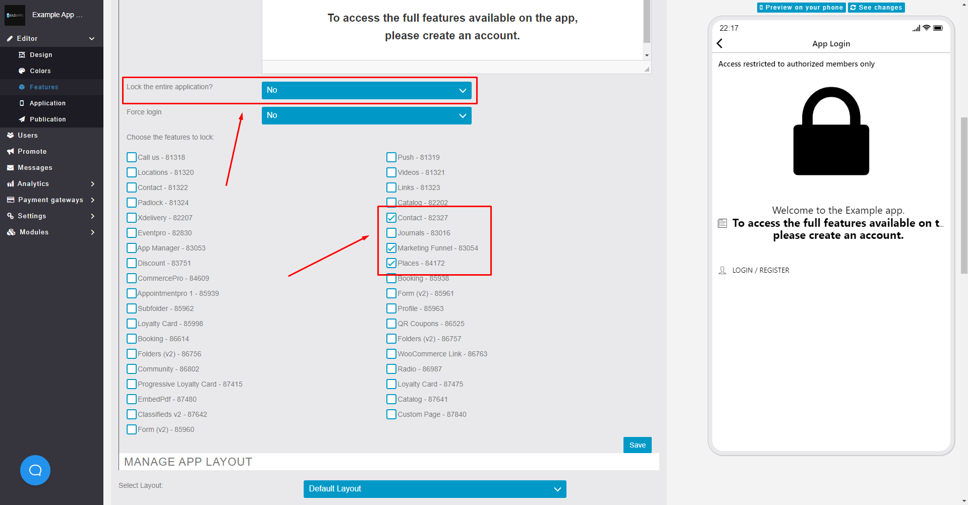 You can choose to lock specific features (as shown in Image.1 below). In the image you can see that only the "Contact", "Marketing Funnel" and "Places" features are locked, the other features would be available for guest accounts to use on the app:
