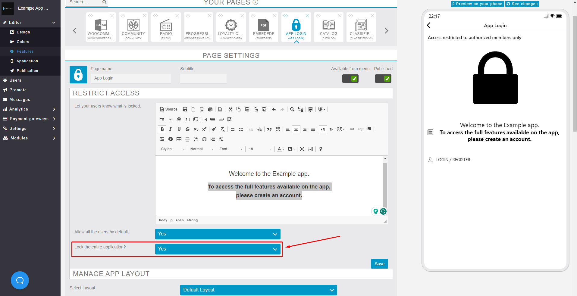 You can choose to lock the entire app, hiding all content from guest users until they create an account (Please see Image.2 below):