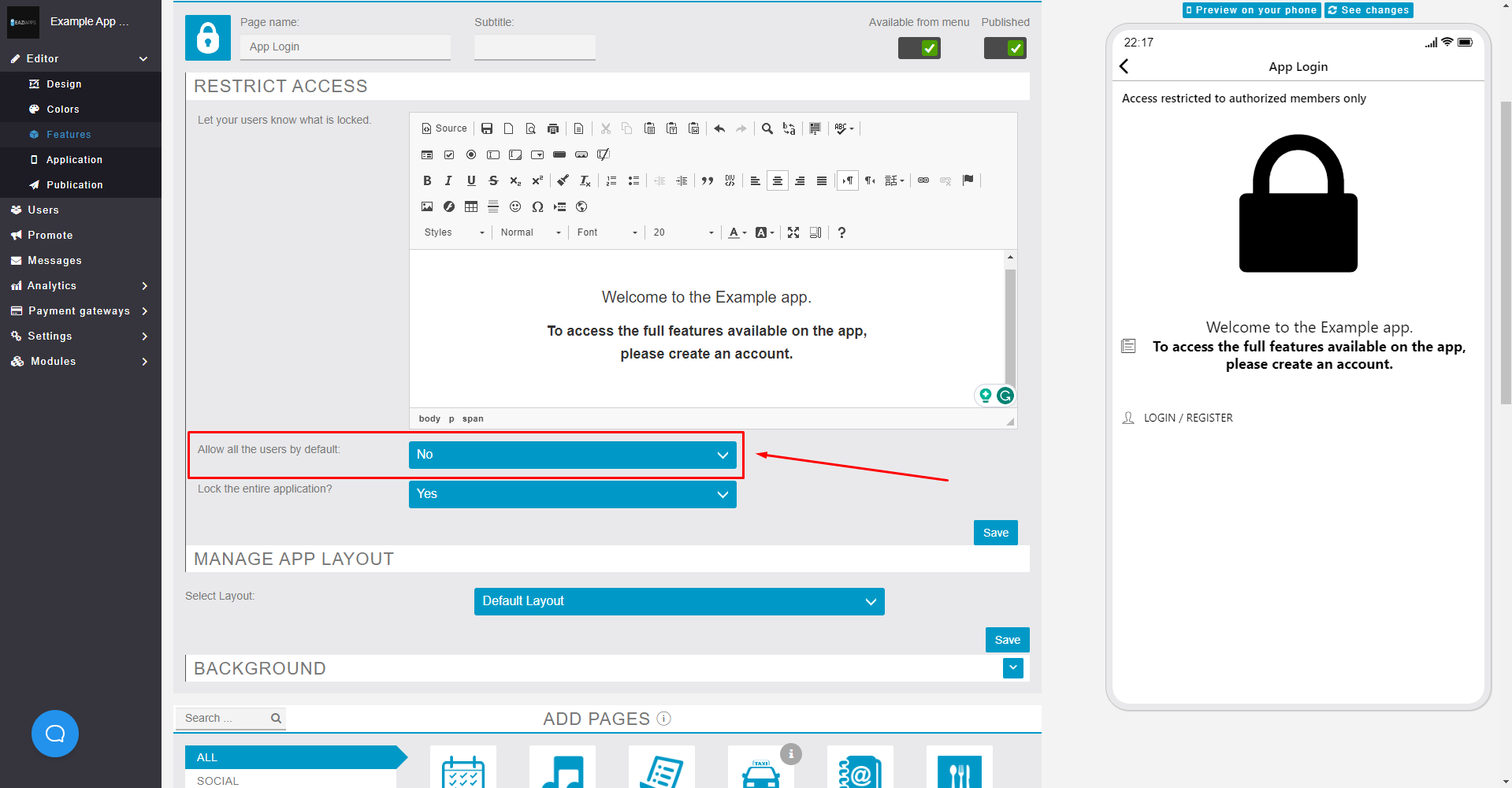 By selecting "No" for "Allow all the users by default" (see Image.3 below), you can force users to submit an access request before allowing them access to the app (or specific features). This allows you or your client to vet all users. (Please see the image below).